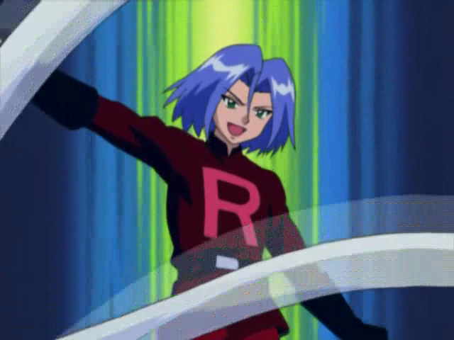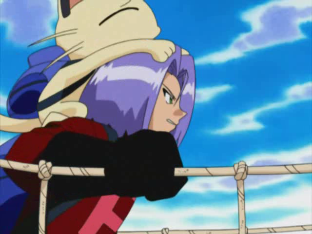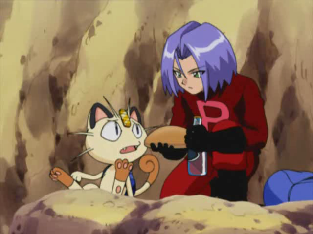 However, James seems oddly determined to succeed with Jessie during their military-esque strength and deprivation training, and Jessie is taken aback by his compassion; he gives up part of his own food to feed their new (and very hungry) Meowth, plus helps the Meowth across through the river and up the cliffsides.
