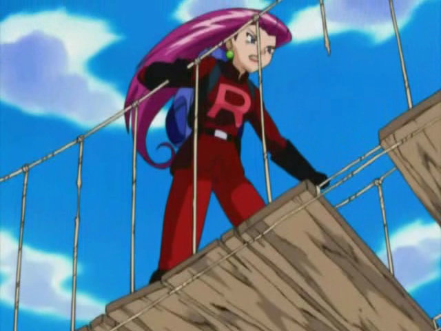 Later, the three are trying to cross a rickety, splintered wooden bridge, the only way to get across the river in their path. Jessie boldly leads the way and barely gets herself across, but when James comes along carrying Meowth, the bridge's ropes finally give way underneath him.