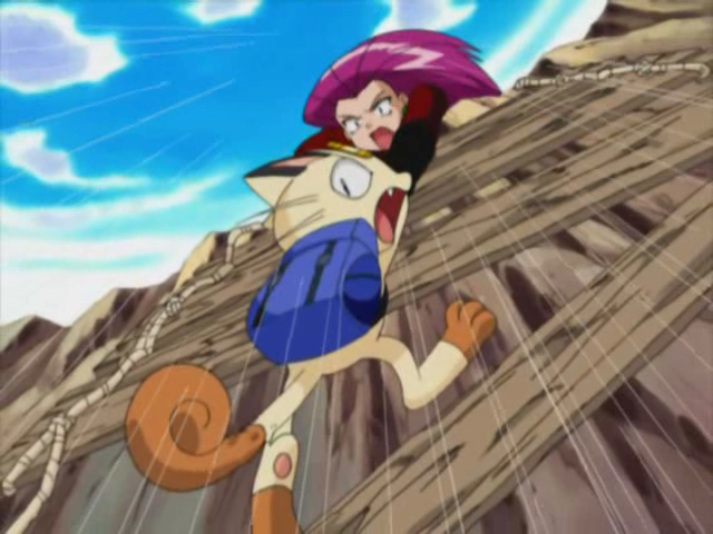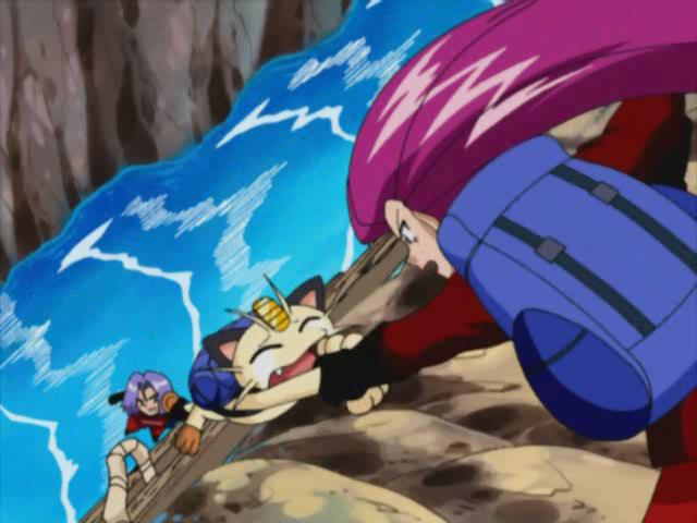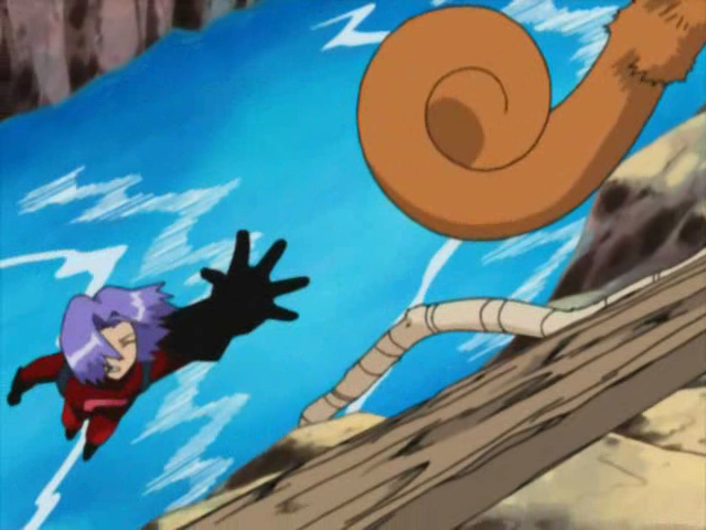 James ends up dangling by Meowth's tail as Jessie holds onto Meowth's front paws, barely safe from the swift river below.